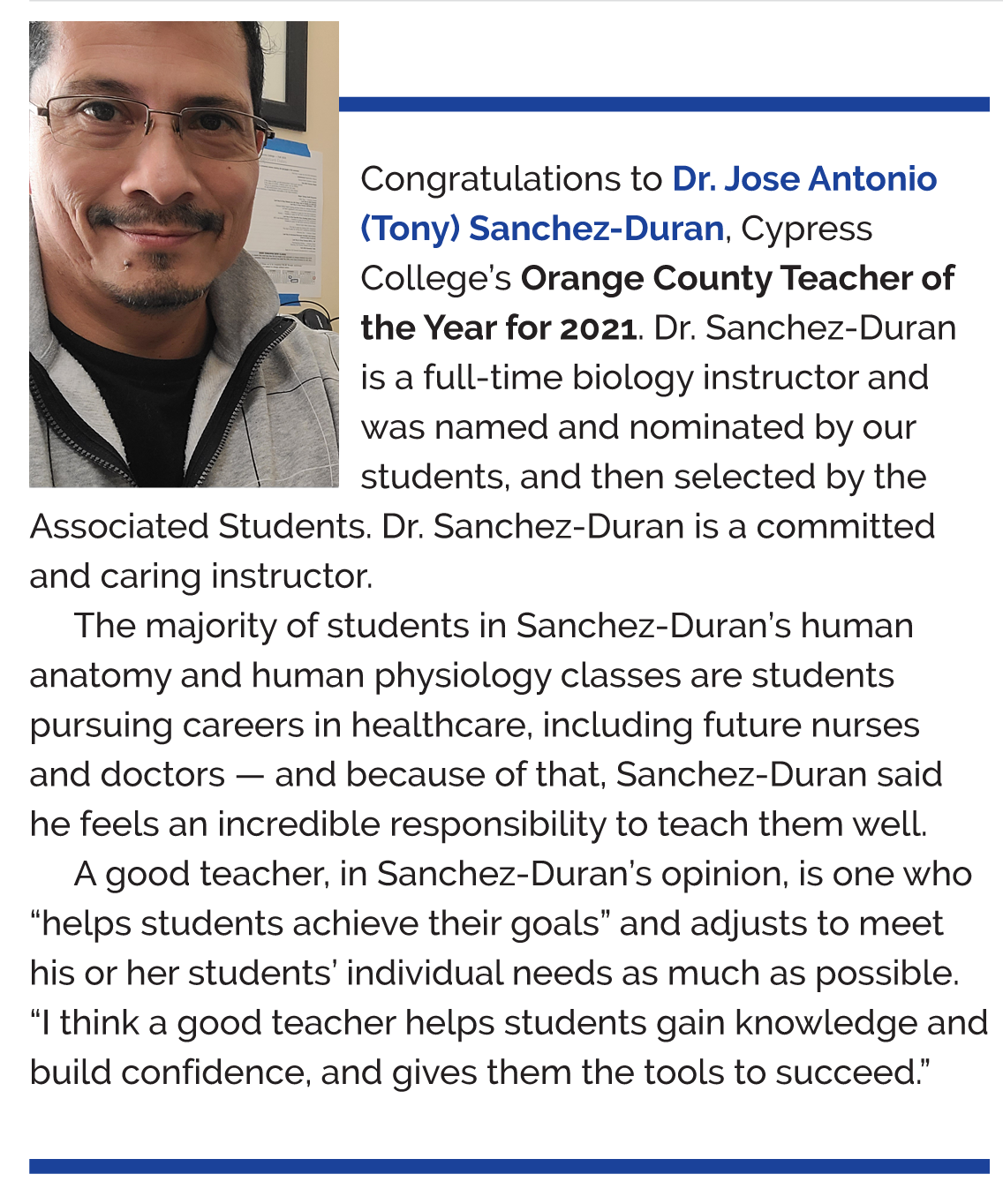 I am currently teaching Human Anatomy (B231), Human Physiology (B241), Human Anatomy & Phyiology (B210), Integrated Medical Science (B160), and General Biology (B101) at Cypress College. I was also the Cypress College Orange County Teacher of the year in 2021.